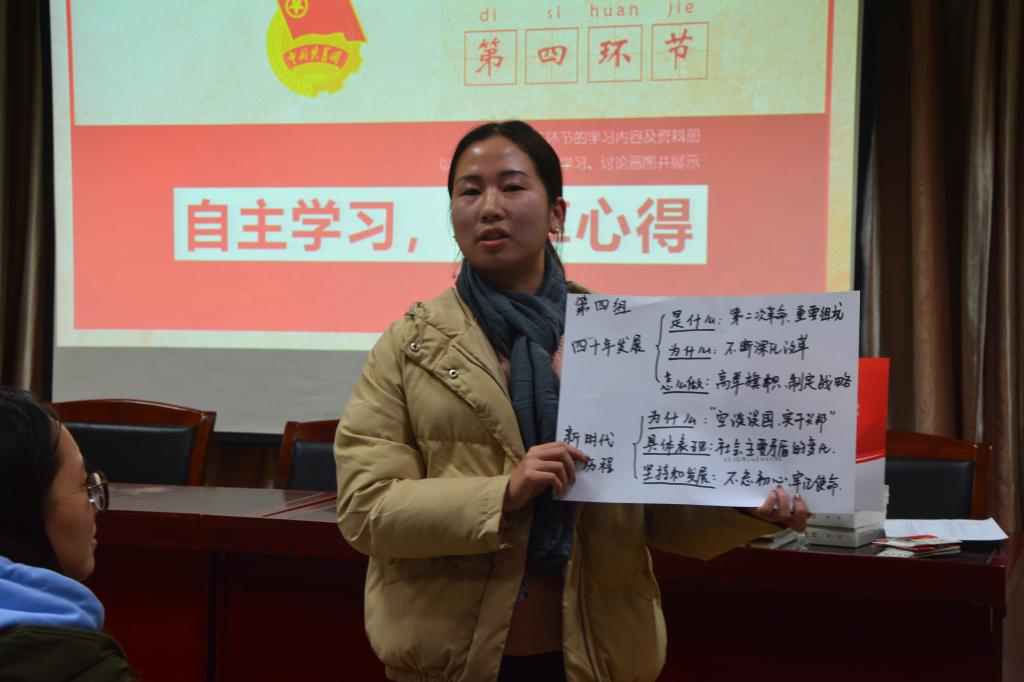 本次活动还邀请了我院青马培训班的和诗雨同学以及团委副书记冉泽宇同学。和诗雨同学根据自己的学习由衷说到:“今天的活动很有意义,通过闯关的形式提高了团员学习理论知识的积极性,也为团干开展团日活动提供了新思路,新模式。我认为作为一名团干,首先要具有较高的政治素养,扎实理论基础知识;其次要具备较强的学习能力,学生干部先学生后干部,在学习上要做到表率作用;最后要具有一定的组织能力,充分调动大家对学习、生活的积极性,与大家共同进退。作为团干要学会自我教育、自我管理、自我服务、自我监督,可以通过开展团日活动学习理论知识,以身作则将改革开放的精神以实际行动传递给每位同学。”管理党建工作的冉泽宇同学向党员同学建议到:“党员应该思想坚定,对待党的安排绝对服从,积极学习时事并且能积极参与党日活动。”最后,本次活动的负责人王志总结到:“今年是改革开放40周年,40年前伟大的邓小平同志提出了改革开放方针,为中国发展道路指明了方向。为庆祝改革开放40周年,我们组织开展了本次学习交流会,通过本次交流会,旨在向大家展示改革开放的光辉历程和今日的中国在改革开放政策下的取得的伟大成就,从而坚定新一代青年的信仰,让我院青年们在改革开放的春风中,坚持着报效祖国、服务人民、奉献社会的价值取向,始终怀有强烈的爱国热情,成为实现中华民族伟大复兴的有理想有抱负的新一代青年。”