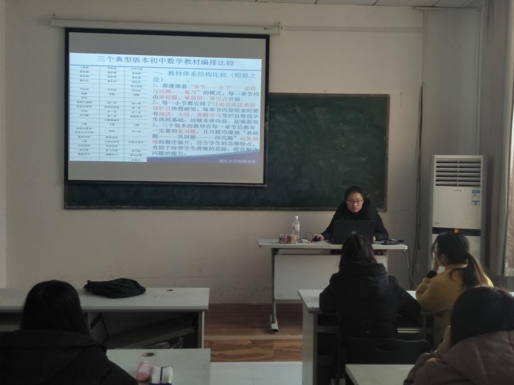 杨老师首先将三个典型版本初中数学教材的编排进行了比较。她指出,人教版较重视章节的知识结构与思考环节,北师大版强调学习目标与总复习的设计,而苏教版注重计算机操作与教学活动。之后,她将人教版教材的编写意图向同学们作了介绍。初中数学教材内容大体可以分为“数与代数”、“图形与几何”、“统计与概率”和“综合与实践”四个方面,人教版教材的编写具有体系结构的创新,要用欣赏的眼光、学生的眼光和质疑的眼光去研读教材,才能体会到教材编写的精妙所在。
