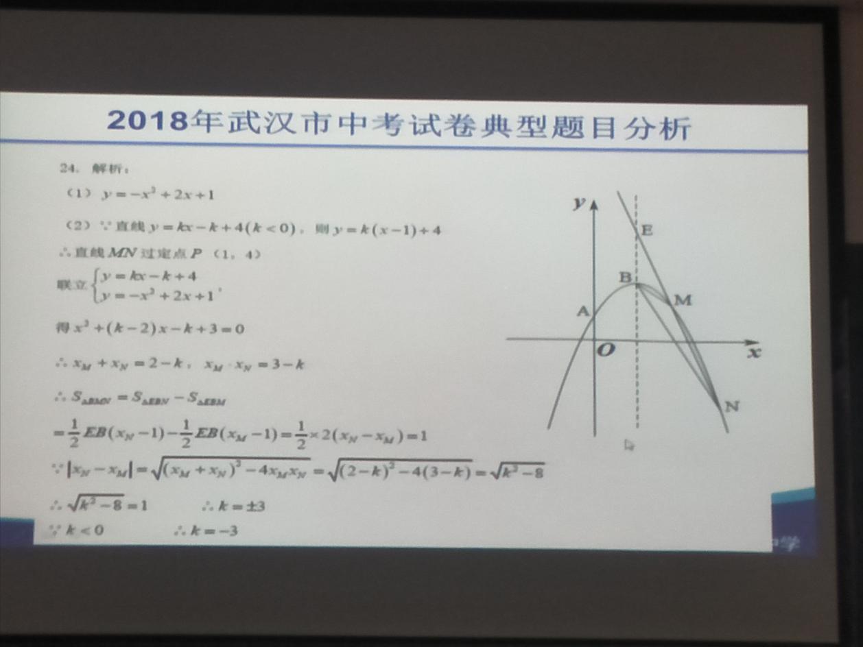 接下来,杨老师对武汉市中考试卷进行了分析。杨老师认为,武汉市中考重视学生对基本方法、基本知识、基本技能的考察,试题一般有多种解法,大多数题目都能从课本上找到影子。她以2018年中考试卷为例,将题型分布、考察内容及考点难度向同学们作了介绍,并着重讲解了选择和解答题中的压轴部分。
