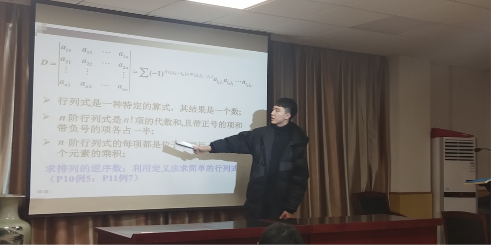 本次课程由我院研究生赵珉浩同学主讲,主要为同学们串讲了线性代数第一章和第三章的重要内容,包含重要知识点的讲解和典型例题的分析。在授课过程中,紧扣重难点,逐步讲解,并结合相关例题具体分析,使得同学们能够更好的掌握,同时同学们积极的提问与交流,使得课堂气氛更加活跃。在讲课结束后,同学们也对本次课程进行了反馈,不仅自身受益颇丰,同时对朋辈导师的教学工作给予肯定,并表示会继续参与后续的活动。