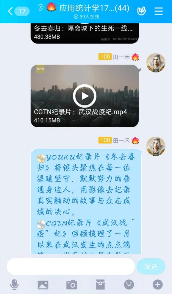 应统1702班以观看纪录片的形式召开班会,挖掘梳理疫情期间强大的正能量。YOUKU纪录片《冬去春归》将镜头聚焦在每一位温暖坚守、默默努力的普通身边人,用影像去记录真实触动的故事与众志成城的决心。CGTN纪录片《武汉战“疫”纪》回顾梳理了一月以来在武汉发生的点点滴滴。一线医护人员为救死扶伤与家人分离、武汉市民挺身而出、志愿者们迅速聚拢,共同维持城市的基本运行。在观看两部战“役”纪录片之后,大家反响强烈,纷纷在班级里评论留言。有的抒发自己的爱国热诚,有的反思舆论监督的得与失,有的表达了对生命、对历史的感悟,有的展现了为国之崛起的未来奋斗目标。