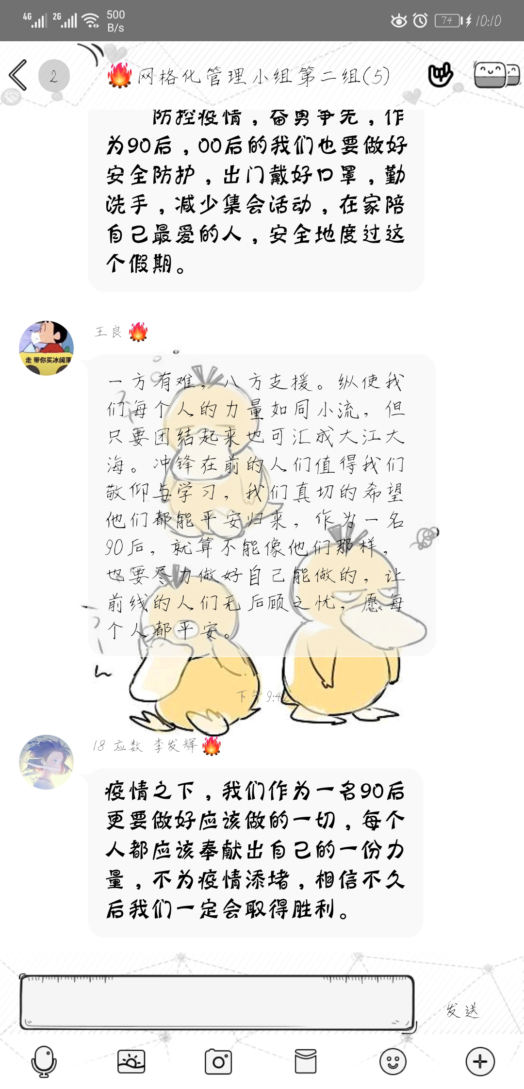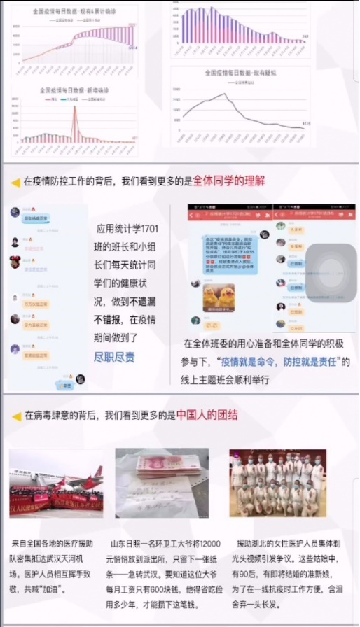 应用统计学1802班班会以网格化小组的方式进行,每位网格化小组组长带领自己的组员学习有关抗疫过程中的英雄事迹。有自愿在测温员、司机、方舱医院播音员、搬运工等职业干了一个多月的小学音乐老师华雨辰;在大年夜从长沙赶到武汉帮忙接送医护人员的快递小哥汪勇;在黄冈版“小汤山医院”火速改建的过程中,那些戴着口罩、自带工具帮忙协助物资搬运和卫生打扫的志愿者们;小女孩由于家里人都得感染了新冠肺炎没人照顾,帮忙照顾小女孩甜甜的黄彩云。