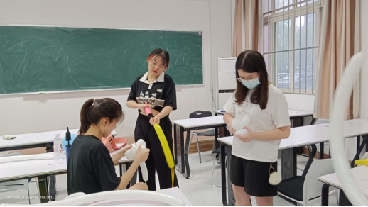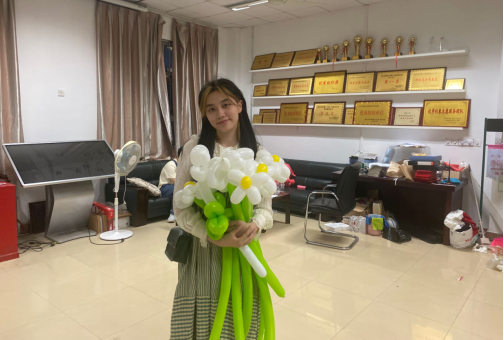 活动现场,数统学院文体部提前布置好活动场所,为同学们准备了气球、打气筒、剪刀等一系列制作气球路引所需要的材料,参与本次活动的同学们在数统学院107签到之后即可领取气球进行自己的创作。参与活动的同学们热情高涨,现场一片欢声笑语,每个人都在用心完成自己的作品,遇到不会的部分仔细观看视频教学或者互相交流,大家把气球扭成花朵的形状,并为它配上花蕊和绿叶,同学们充分发挥了自己的想象力,将学院对大四学子们的祝福表现在各色各样的花朵上,作品多样,精彩纷呈。