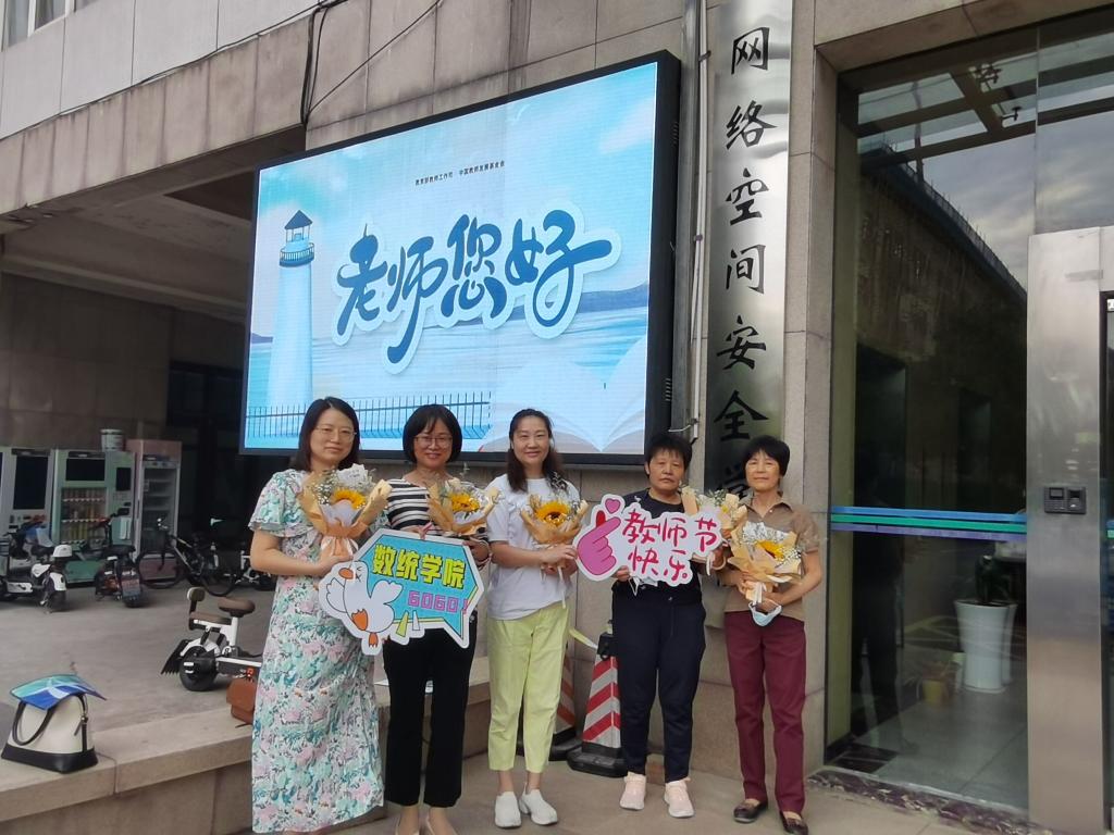 “饮其流者怀其源,学其成时念吾师。”为了让老师们度过一个温暖贴心的教师节,在数统学联会的统筹与组织下,数统学院的学子们为老师精心准备了许多惊喜。在9月9日这一天上午,你可以看到:在课前,有很多学生志愿者为还在授课的老师们送上花篮、数统学院前,同学们摆摊送上“向阳葵”,“鼠标垫”,“红笔”等礼物,在当天各个班级也为上课的老师准备了惊喜,其中21级应用统计班和20级软件产业班用歌声向老师传达着真切的祝福,“写贺卡”“祝福视频”也成为了庆祝教师节的见证……数统学院的师生间,温暖又细腻的互动,令人感动。