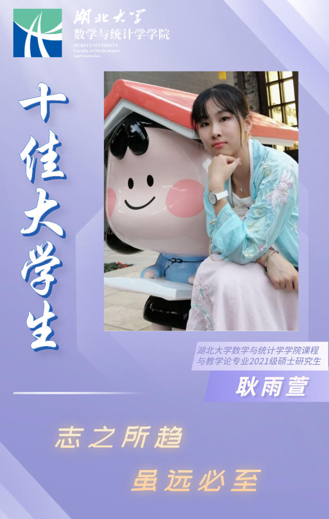 她态度端正,勤奋刻苦。本科期间共有18门课程在90分以上,其中《数学学科教学论的研究》、《中学数学研究》等多门课程取得专业第一。她积极参加学科竞赛,荣获全国大学生数学竞赛三等奖、美国大学生数学建模竞赛M奖、全国大学生数学建模竞赛湖北赛区一等奖、湖北省普通高校师范专业大学生教学技能竞赛一等奖等,共计国家级奖项2项,省级奖项2项,院校级奖项14项。硕士期间参与“华为杯”数学建模竞赛、“正大杯”市场调查与分析大赛等,目前正以学院研究生讲课比赛一等奖的成绩备战省赛。