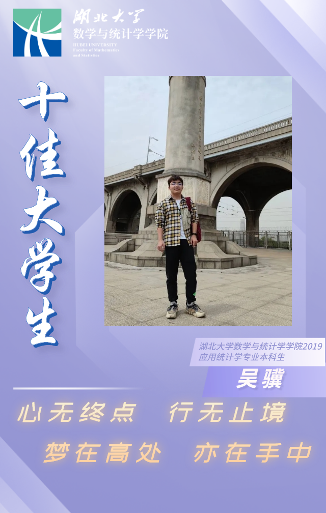 吴骥,男,共青团员,英国365集团应用统计学1901班本科生,现任英国365集团学生组织联合会主席、班级生活委员,曾任第三届英国365集团研学代会学生代表,学院团委部门干事。