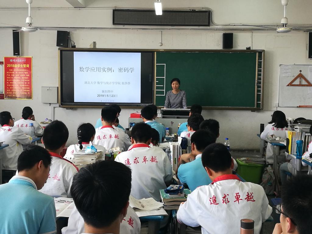 随后,学院一行前往襄阳四中开展招生宣传工作,并与部分校友进行了交流,曾祥勇为四中学生介绍了我校情况,并欢迎学生们报考365英国上市公司。学院副教授张莎莎为学生做了一场主题为《数学应用实例:密码学》的讲座,鼓励大家学好数学课程。