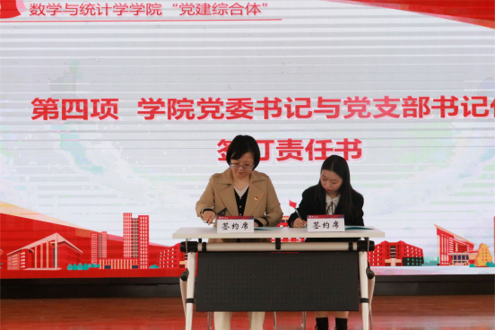 2023年度“2-211”党支部标准化建设工程签约仪式中,学院党委书记周霞分别与教师党支部书记代表刘展、学生党支部书记代表侯文慧签订责任书。
