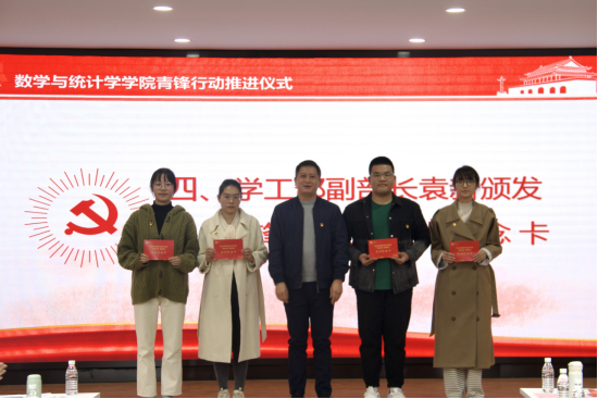“青锋行动”推进仪式上,学院党委秘书陈慧详细解读了《英国365集团“青锋行动”实施方案(试行)》,党委委员刘展宣读了第二届青锋宣讲团成立文件,党委副书记王文锋宣读了青锋党支部成立文件,“青锋宣讲团”成员与班级进行了“蹲班驻点”结对仪式,学工部副部长袁新为“蹲班驻点”结对双方代表颁发青锋行动结对纪念卡。新一届青锋宣讲团成员代表郑可和班长代表21级数学师范1班廖倩茹分别进行了表态发言。