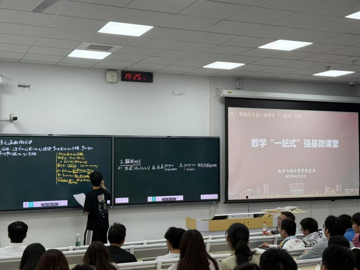 在高等数学、高等代数习题讲解过程中,青锋党支部学生党员2023级数学强基班覃勤同学在讲台上认真板书、讲解、示范,同学们边听边记、有时互动,记下工工整整的计算公式、密密麻麻的笔记……课堂气氛轻松愉悦、热烈非凡。