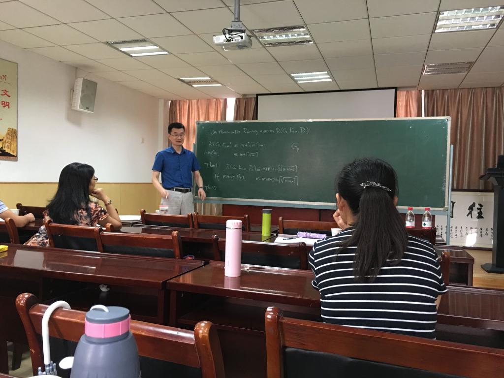 陈耀俊教授的报告题目为《On Three-color Ramsey number R(C4,K1m,Pn)》。报告中,他首先对Ramsey number进行了定义,其次进行了举例说明,然后对得出新的结果进行了讲解并将其延伸到R(C4,K1m,Pn)中。