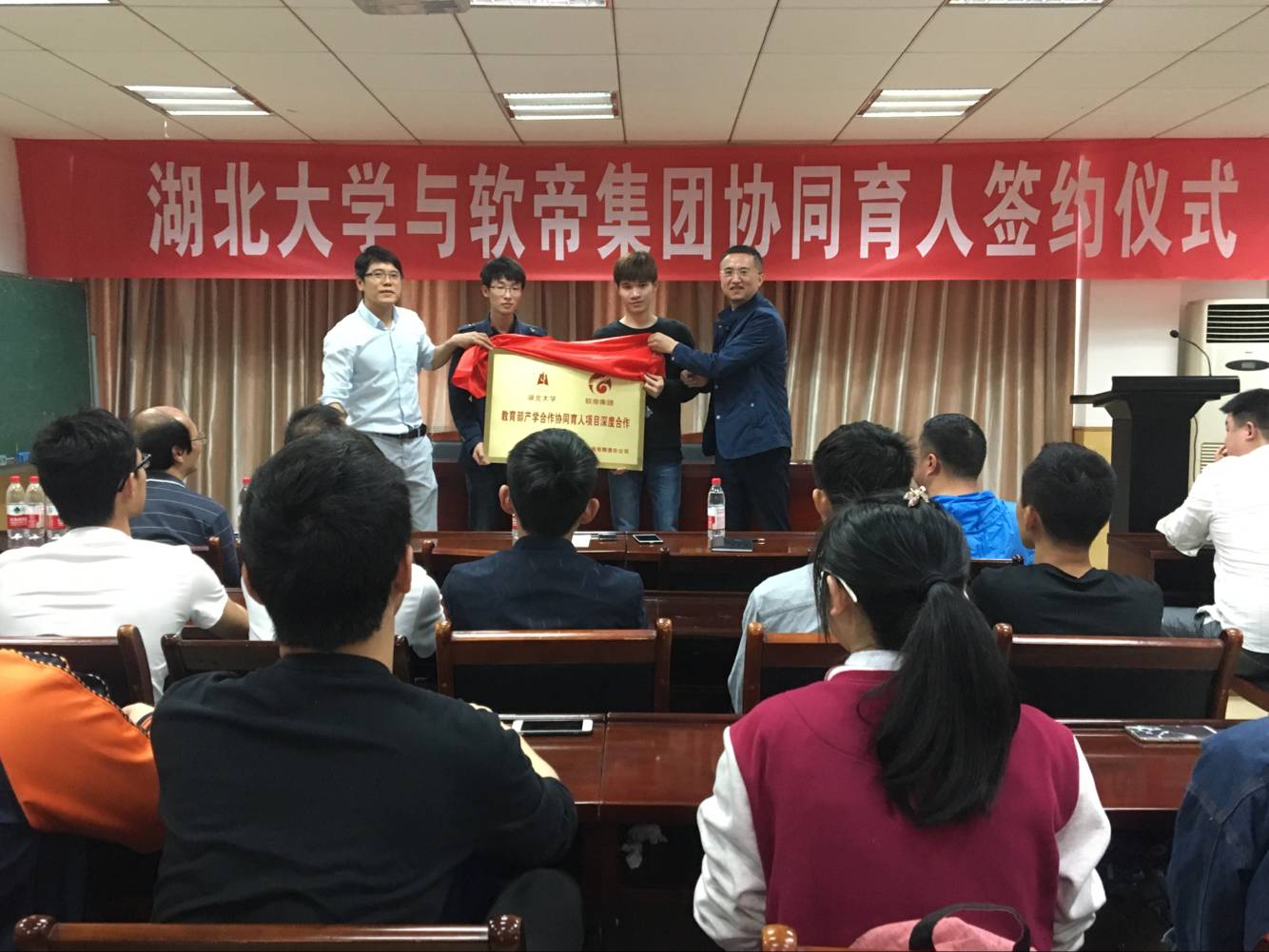 软帝集团董事长李杰和教务处李其锋在热烈的掌声中共同为本次签约仪式揭牌。随后李杰先生同数统学院陈媛等八位成功申请项目的教师进行了庄重的现场签约仪式。
