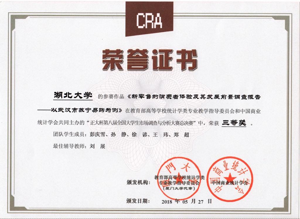 据悉,全国大学生市场调查与分析大赛是由教育部高等学校统计学类专业教学指导委员会与中国商业统计学会共同主办的竞赛,旨在提高大学生实践能力,增强大学生使用工具分析数据的水平。竞赛分为省级分区赛和全国总决赛,这是我校首次参加该项竞赛。经过个人知识网考、查阅资料、发放问卷、撰写报告、专业委员会评审等环节,我院刘展老师指导的2015级应用统计学专业彭庆雪、孙静、徐谚、王玮、郑超团队撰写的《新零售的消费者体验及其发展前景调查报告——以武汉市苏宁易购为例》获得全国三等奖。