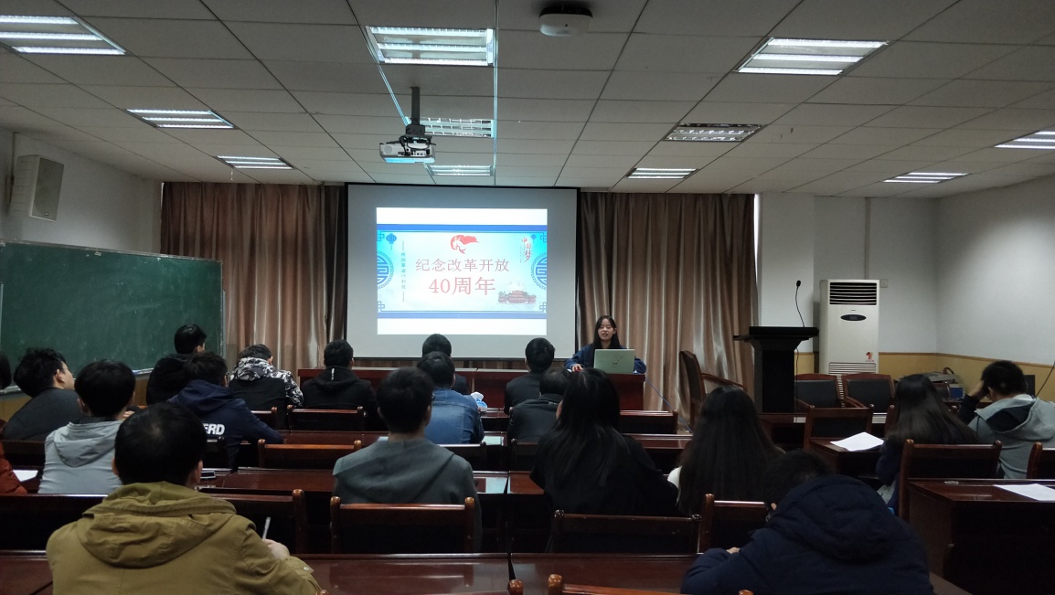 应用统计学1701团支部在数统学院201教室开展了主题为“承改革开放之任,续稳步发展之风”的庆祝改革开放四十周年团日活动。此次团日活动内容主要包括团活动小组分别深入调查了解改革开放以来四个十年里中国在各领域发生的显著变化及取得的重大成果、制作成PPT并配以相关视频进行汇报展示、团支书宣讲邓小平生平事迹和知识竞答环节。全体团员共同学习这位中国共产党第二代领导集体核心人物邓小平的创新精神、实干精神,不断提高自我境界。
