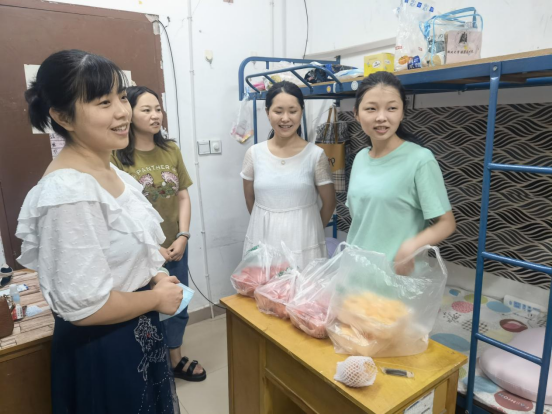 走进学生宿舍,何书记与同学们亲切的交谈,询问同学们的学习情况,思想状态和生活情况,对考研同学认真备考的学习精神和态度予以肯定。同时强调留校学生要严格遵守校纪校规,服从遵守学校日常管理和住宿管理,注意疫情防控和防暑降温。最后鼓励同学们要充分利用假期,进一步加强专业知识学习和实践,做好规划和准备,叮嘱同学们要养成科学作息时间,注意营养,保持健康,劳逸结合,为考研提供身体保障,并预祝大家被心仪的学校录取。留校学生纷纷表示,学院老师送来鼓励和温暖,让大家备受鼓舞,增加了大家学习的信心和动力,一句“西瓜真甜”,不仅是瓜甜,更是心甜。