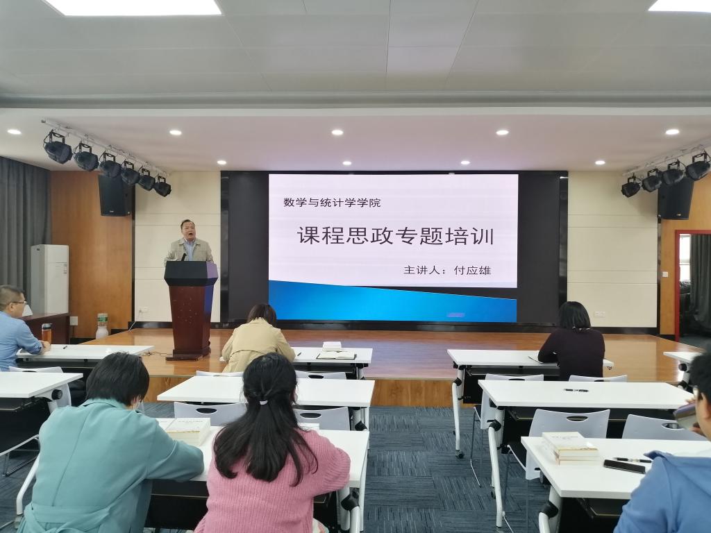 培训会由付应雄副院长主讲。付院长介绍了高校课程思政的意义,根据我院专业特点,结合具体实例探讨了思政教育融入数学专业课程教育教学的实施路径和方法,特别提到数学史在培养学生的民族认同感、文化自信和爱国热情方面的巨大作用。强调高校课程思政要求任课教师不断提高自身修养,率先垂范,落实立德树人的根本任务,要将学生价值观塑造融入到课程教学中,实现“三全”育人,形成学生专业知识、价值观和哲学观的良性互动和循环。