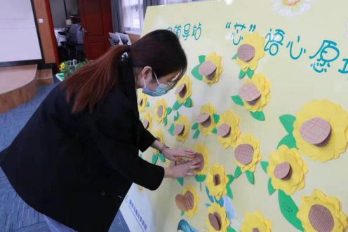 志愿者代表荣欣怡带领大家制作向日葵“芯”语心愿卡。老师和同学们都积极参与,热情高涨。大家在卡片上写下自己对新学期的期许并依次将其粘贴在“芯”语心愿墙上,学生代表交流了参加本次活动的感受和体会,祝愿大家的未来就像向日葵一样,永远朝向太阳,永远阳光明亮!