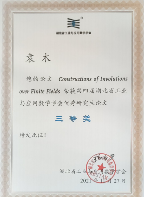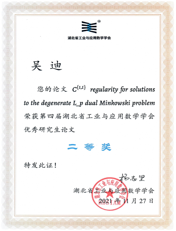 我院博士研究生在第四届湖北省工业与应用数学学会优秀论文评比中荣获二、三等奖,2022年4月16日,第四届湖北省工业与应用数学学会在武汉举行。在学会优秀论文的评选中,我院博士研究生吴迪、袁木的论文分别荣获二、三等奖。