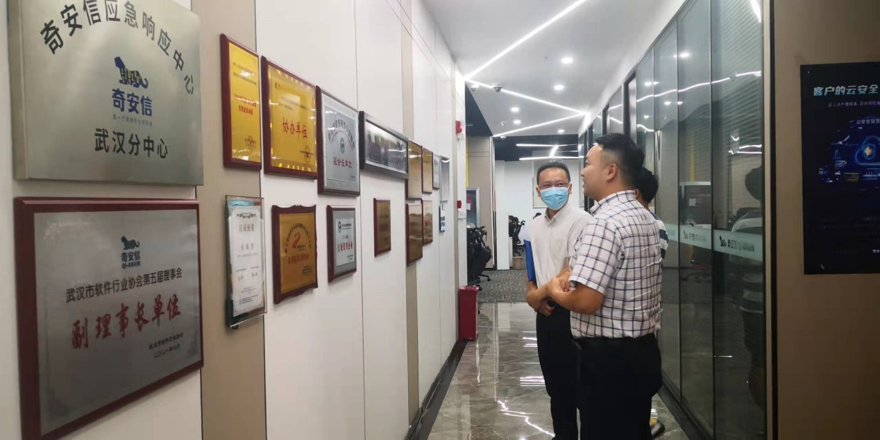 郑大彬一行参观了奇安信科技集团湖北分公司,并与相关负责人开展了座谈交流。座谈会上,潘俊杉老师介绍了学院的基本情况和科研成果,郑大彬副院长对学院的学科发展和科研团队做了介绍。奇安信湖北分公司副总经理张宇详细介绍了奇安信集团成长为网络安全领域头部企业的发展历程,教育行业经理向瑜介绍了奇安信在校企合作、人才协同培养方面的成果,张宇表示希望后期能在科研成果转化、人才培养等方面与学院开展合作。