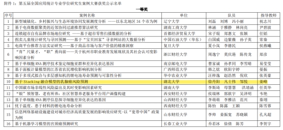8月19日,2022第五届全国应用统计专业学位研究生案例大赛结果公布,我校英国365集团师生荣获全国一等奖1项、二等奖2项、三等奖2项,其中由姜峰老师指导,徐丹阳、凡士伟、邹悦完成的案例作品《基于Stacking融合模型的乳腺癌风险预测》荣获全国一等奖。