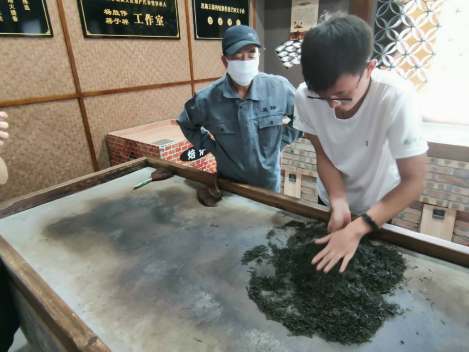 在陈师傅的指导下,团队成员体验了“整形上光”工序。看似简单的四则手法,却要在100℃高温的熔炉台上持续40至50分钟。许多年轻学徒,或经不住高温的考验、或耐不得做茶时的寂寞,导致学艺中途而废。如陈师傅所言,茶艺人需要的是持之以恒与敢于吃苦的精神。同样作为恩施玉露第十一代传承人的他,对于这项工艺早已烂熟于心。